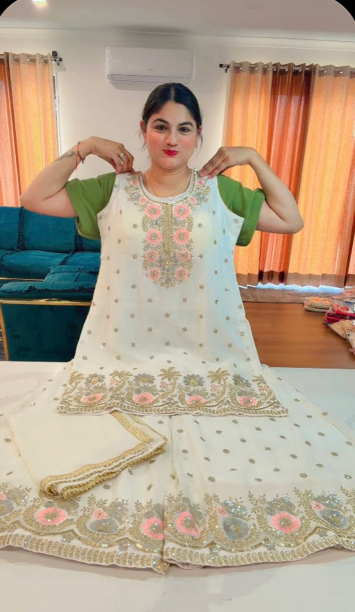 White Hand touch Sharara suit on Georgette ( Note- Minor marks as Manufacturing error on Bottom ) Picture attached ——- ON Clearance