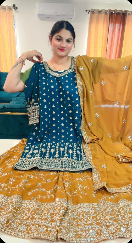 Party Wear Heavy Sharara suit on Georgette - Colour ( Teal Blue + Mustard )