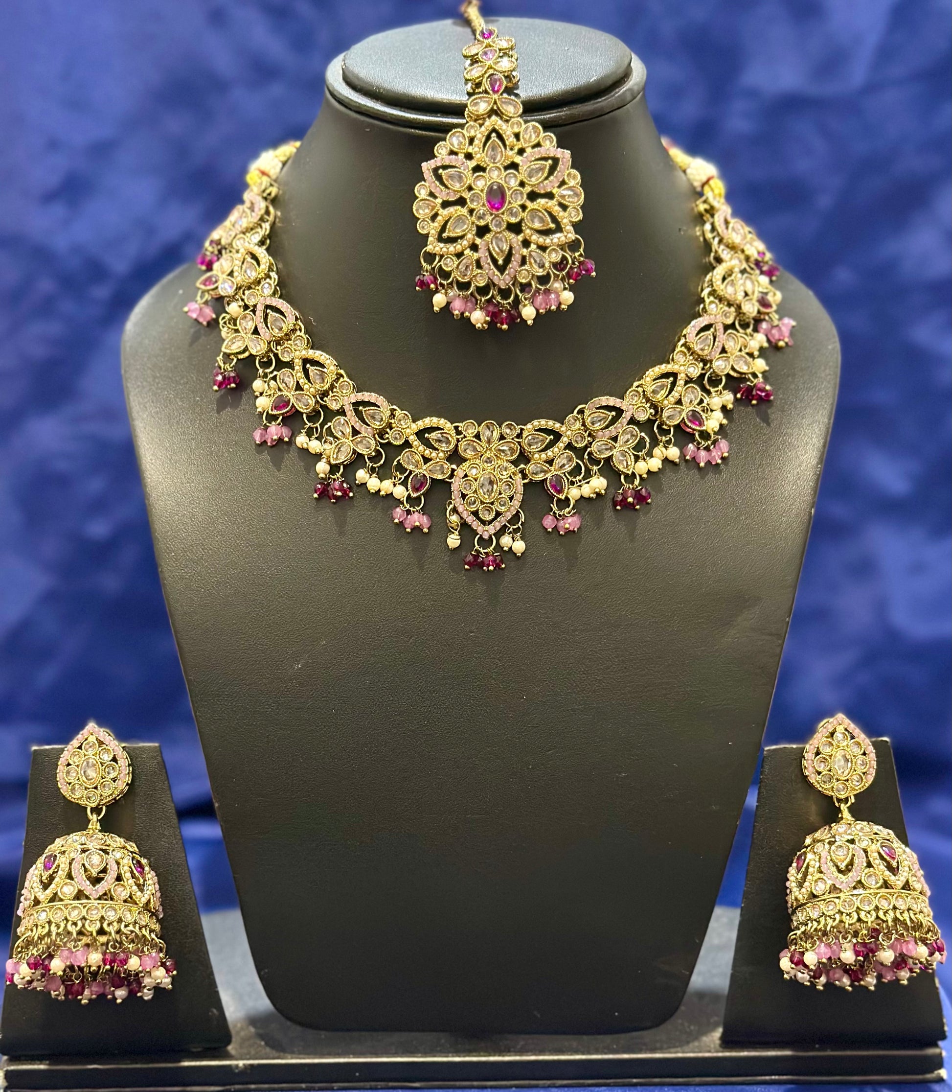 Necklace set with earrings and tikka in polki, Colour: Purple, Code: 083