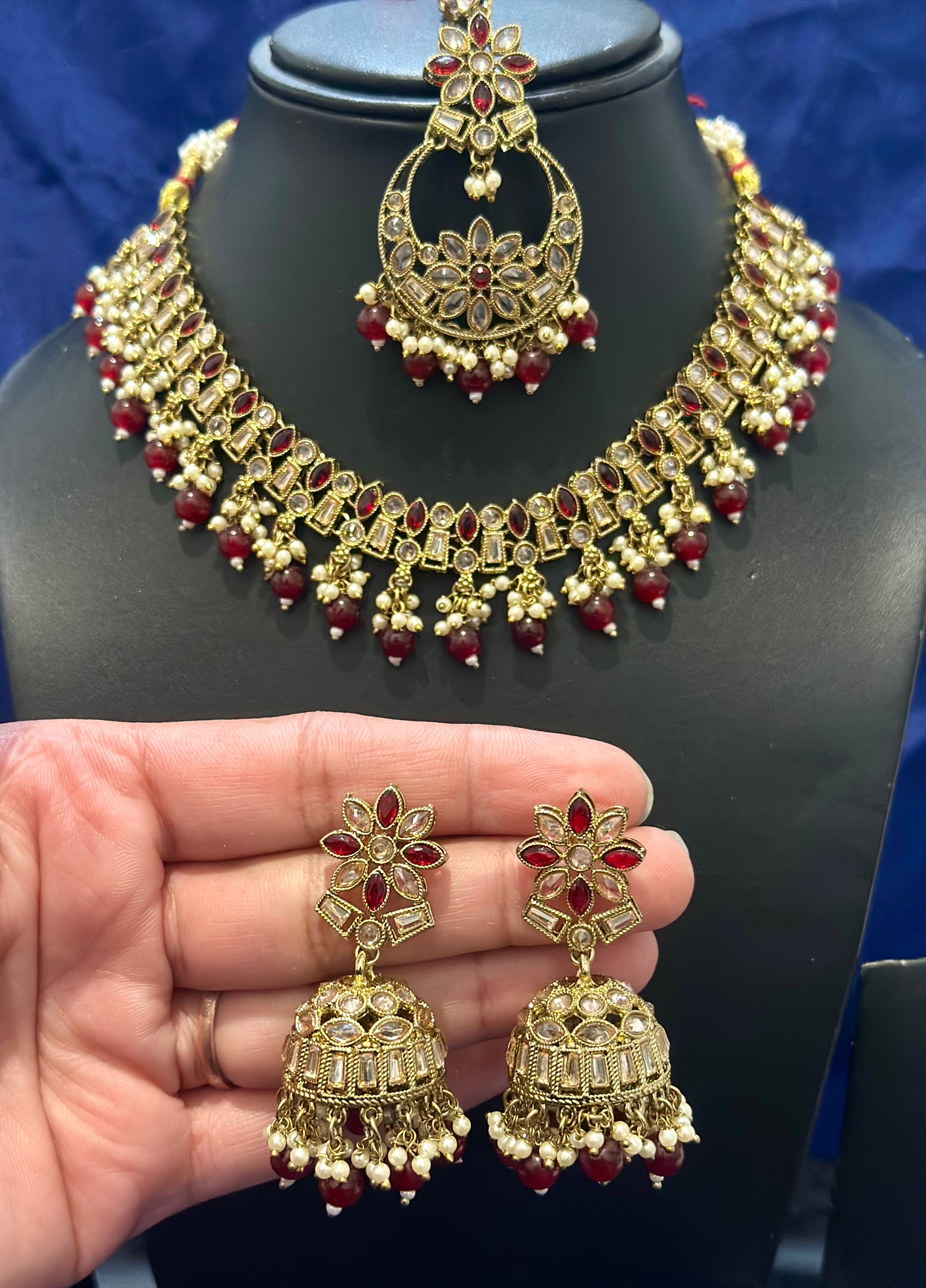 Necklace set with earrings and tikka in polki, Colour: Maroon, Code: 108