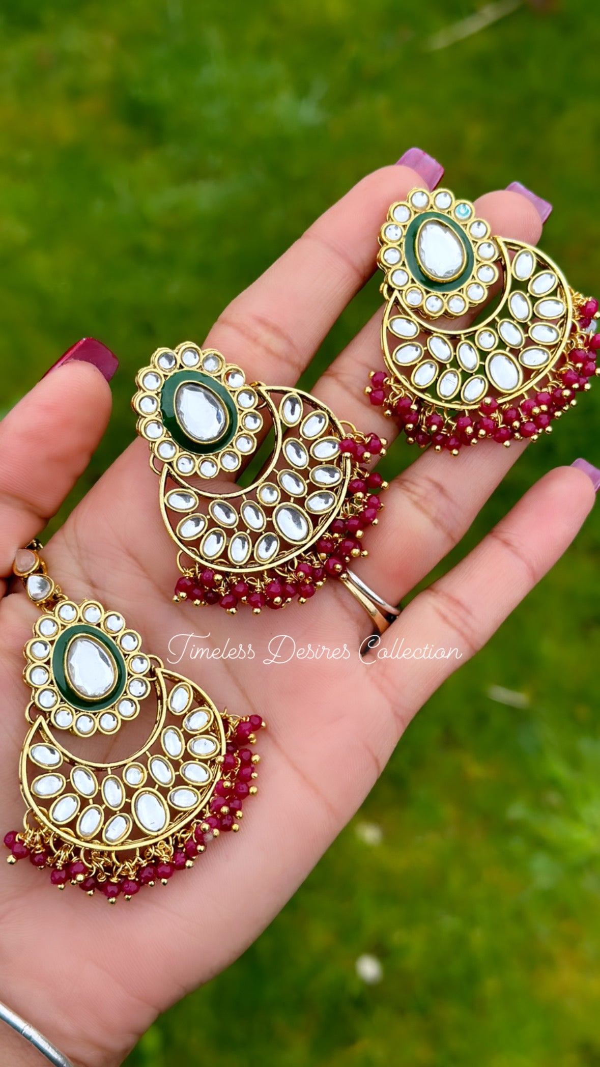Purple or wine earrings and tikka set in Kundan